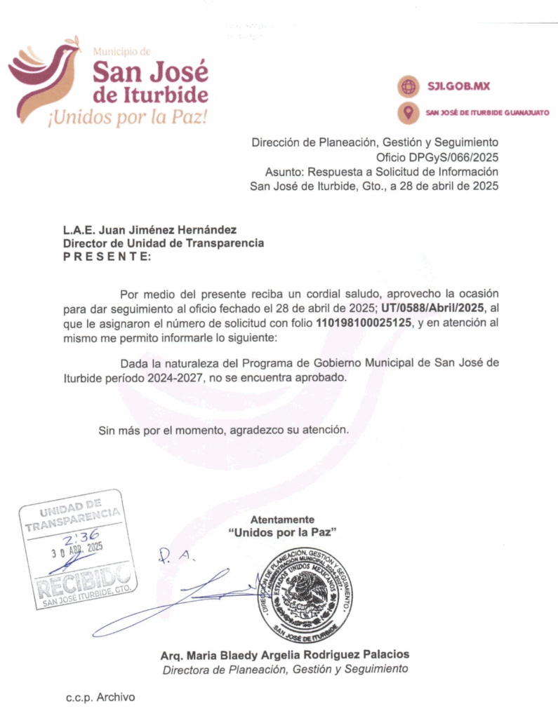 Ante una solicitud de información pública, el propio gobierno municipal respondió que, “dada la naturaleza del Programa de Gobierno Municipal de San José de Iturbide período 2024–2027, no se encuentra aprobado”. Esta situación ha generado preocupación, ya que el artículo 278 de dicha ley establece con claridad que este documento debe ser elaborado y aprobado por el Ayuntamiento dentro de los primeros cuatro meses de gestión.